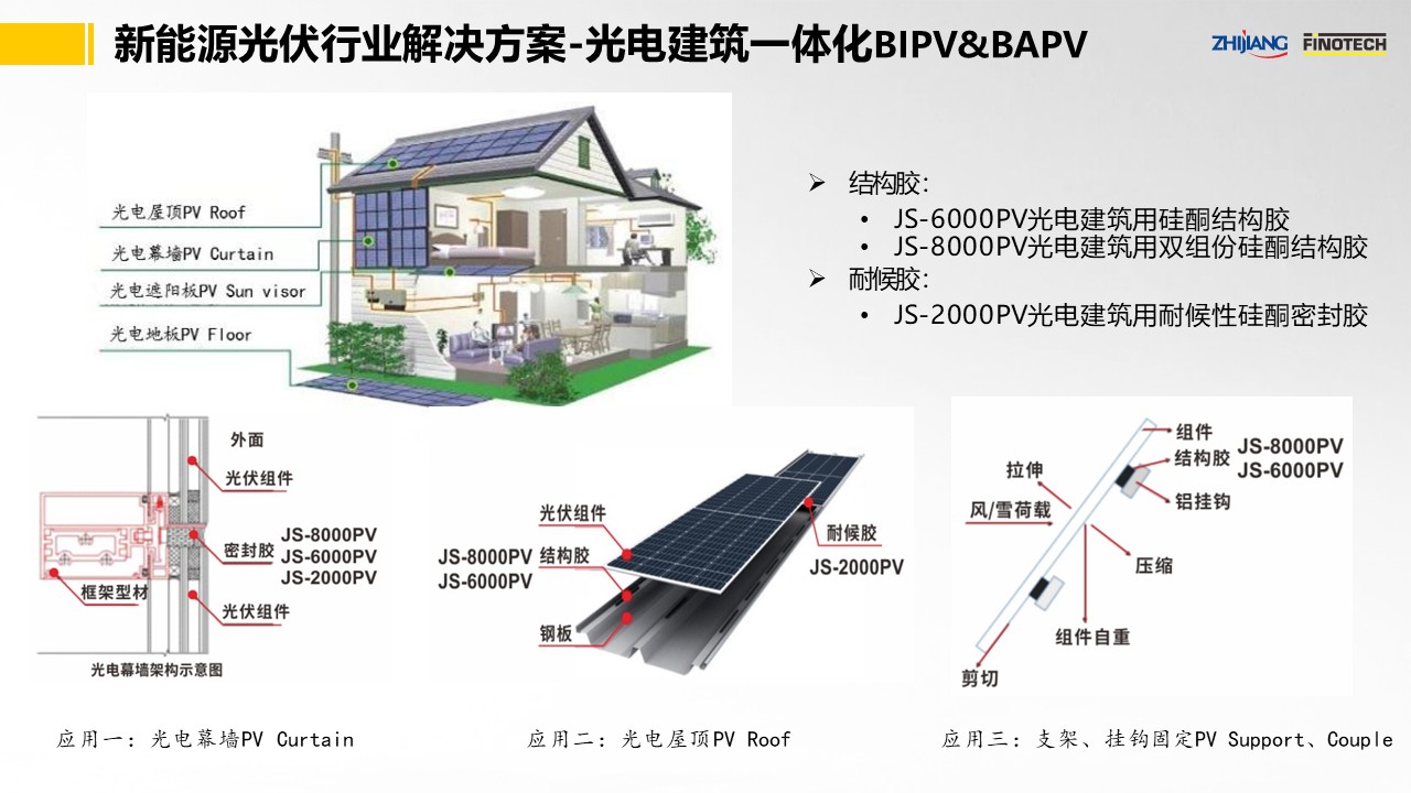 之江公司依托密封膠領(lǐng)域多年的創(chuàng)新平臺(tái),推出了優(yōu)異的光伏行業(yè)用膠解決方案以及光電建筑一體化解決方案,開發(fā)出了性能優(yōu)異的JS-6000PV/JS-8000PV光電建筑用結(jié)構(gòu)膠、JS-2000PV光電建筑用耐候膠等有機(jī)硅系列品種,應(yīng)用于光電建筑幕墻、光電屋頂、組件掛鉤粘接等方面。